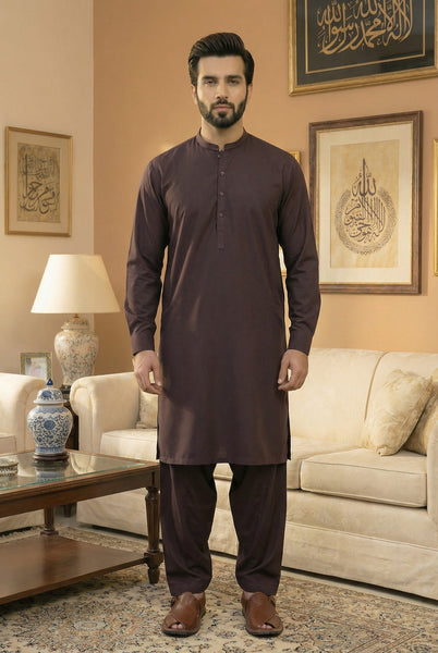 This suit is the epitome of understated luxury. Built from elite Wash & Wear fabric, it offers a rich texture and a comfortable feel against the skin. The structured collar and meticulously stitched placket reflect superior attention to detail. Whether for a wedding or a festive celebration, this suit provides a graceful look that requires minimal maintenance.