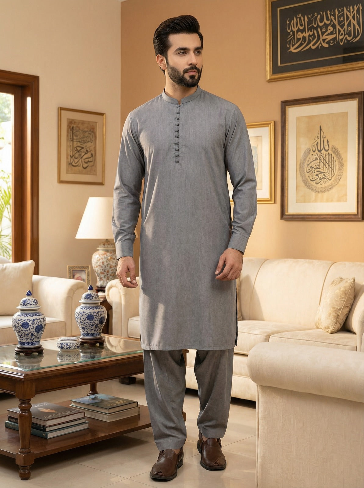 This grey kurta suit stands out with its intricate button detailing along the placket, offering a sophisticated look for special occasions. The premium Wash & Wear material provides a luxurious hand-feel while being incredibly easy...