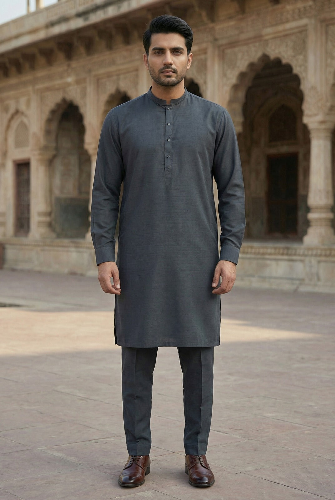 Engineered for both elegance and endurance, this ensemble is crafted from high-performance Wash & Wear fabric. It offers a sophisticated drape and a wrinkle-resistant finish, ensuring a polished look from day to night. The design features a structured mandarin collar and a meticulously tailored placket, making it a timeless addition to any gentleman's wardrobe.