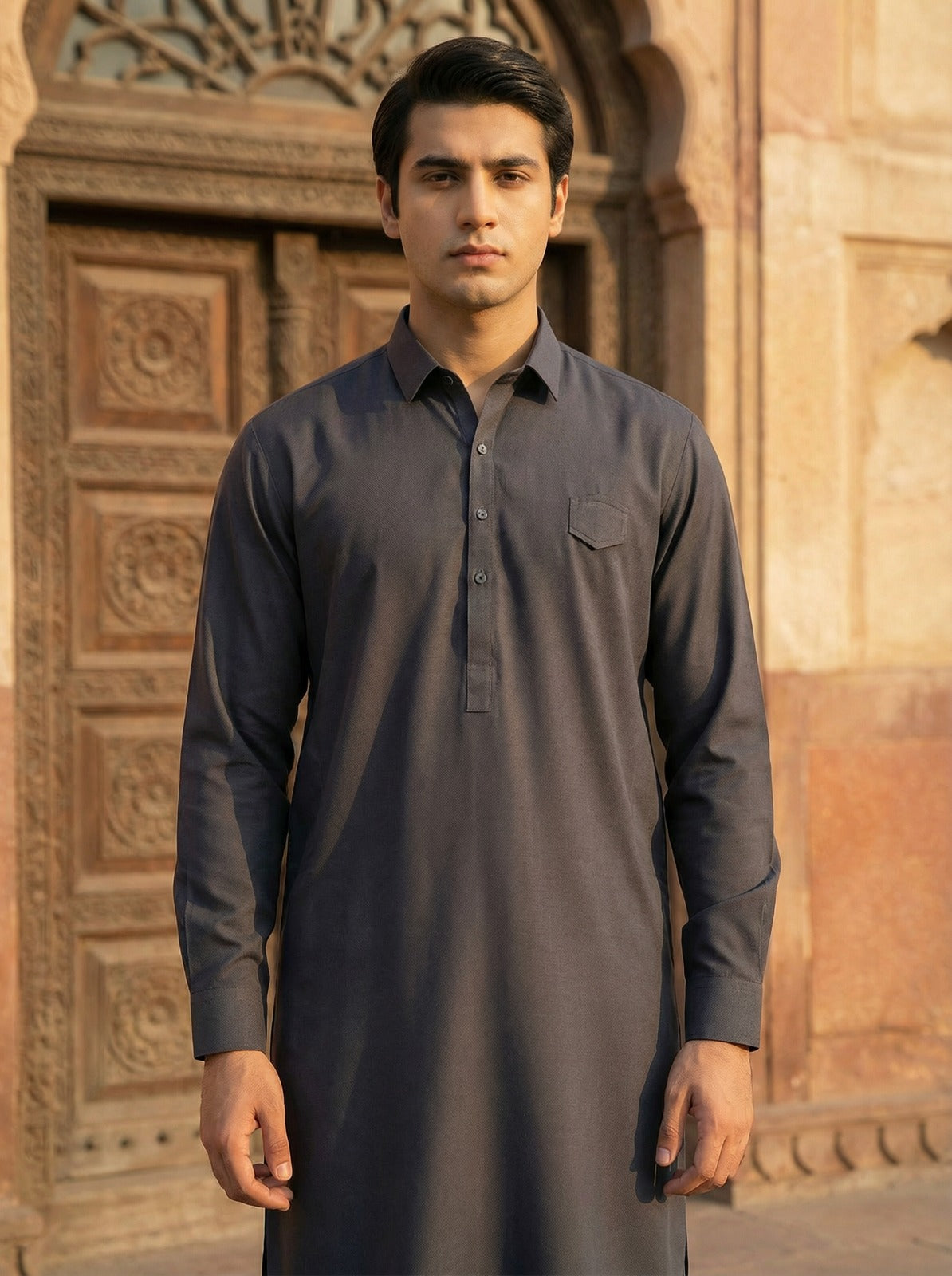 Transition effortlessly from casual to semi-formal with this charcoal kurta featuring a modern shirt-collar design. The addition of a functional chest pocket adds a utilitarian touch to its sleek, urban aesthetic. The Wash & Wear fabric ensures you stay sharp and composed, making it a go-to choice for the busy professional.